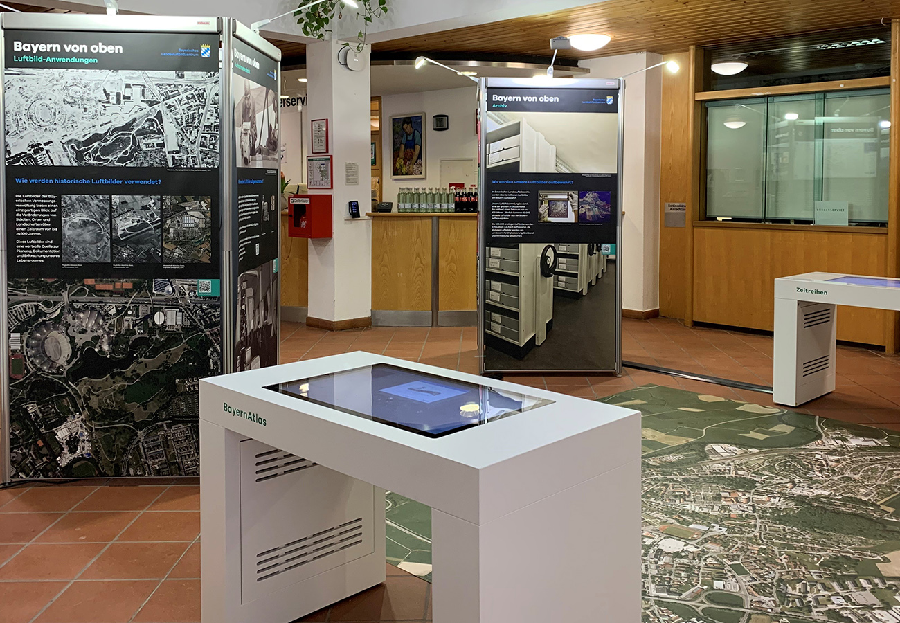 Anlässlich des fünfjährigen Bestehens des Bayerischen Landesluftbildzentrums stellte die Wanderausstellung dessen Angebote einem breiten Publikum vor. Die multimedial gestaltete und leicht verständlich aufbereitete Ausstellung vermittelt einen spannenden Einblick in die Geschichte und Technik der Luftbildfotografie. Auf 14 Ausstellungstafeln wurde den Besucherinnen und Besuchern gezeigt, wie Luftbilder gemacht werden, wie sie aufbereitet werden und wo sie eingesetzt werden.