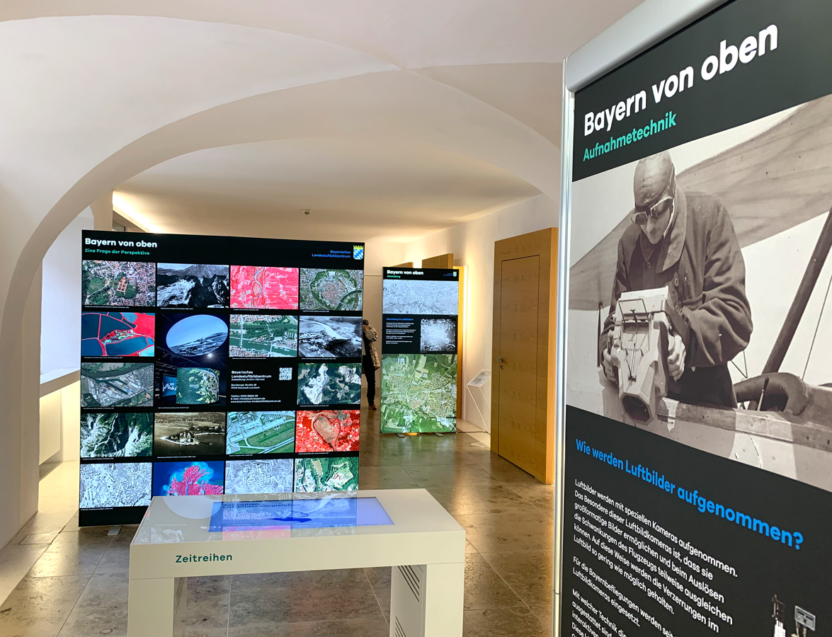 Anlässlich des fünfjährigen Bestehens des Bayerischen Landesluftbildzentrums stellte die Wanderausstellung dessen Angebote einem breiten Publikum vor. Die multimedial gestaltete und leicht verständlich aufbereitete Ausstellung vermittelt einen spannenden Einblick in die Geschichte und Technik der Luftbildfotografie. Auf 14 Ausstellungstafeln wurde den Besucherinnen und Besuchern gezeigt, wie Luftbilder gemacht werden, wie sie aufbereitet werden und wo sie eingesetzt werden.